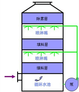注:為了清除廢氣中的灰塵廢氣,則在塔體底部的水池中加入清水即可,如果為了清除氣體中所含的酸性成分則需要將底部的水更換為堿溶液(以氫氧化鈉為主)。
